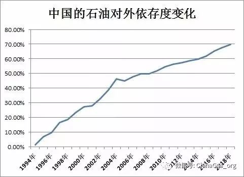 自2014年以來(lái),中國(guó)的能源形勢(shì)發(fā)生了很大變化,尤其是油氣對(duì)外的依存度逐年攀升。2014年-2017年,中國(guó)石油對(duì)外依存度分別為59.5%、61.8%、65.4%、67.5%。2018年則創(chuàng)下50年新高,根據(jù)BP能源統(tǒng)計(jì)年鑒:2018年中國(guó)原油加工量和石油表觀消費(fèi)量雙破6億噸,石油對(duì)外依存度高達(dá)70%。